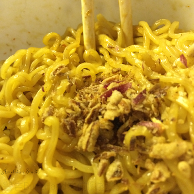 煲水,開麵,唧醬——唧之前用廚房較剪剪開包裝,齊口易啲處理。勿怕污糟,把較剪最多之後再洗。粉同炸洋蔥千.祈.唔.好.落.住。