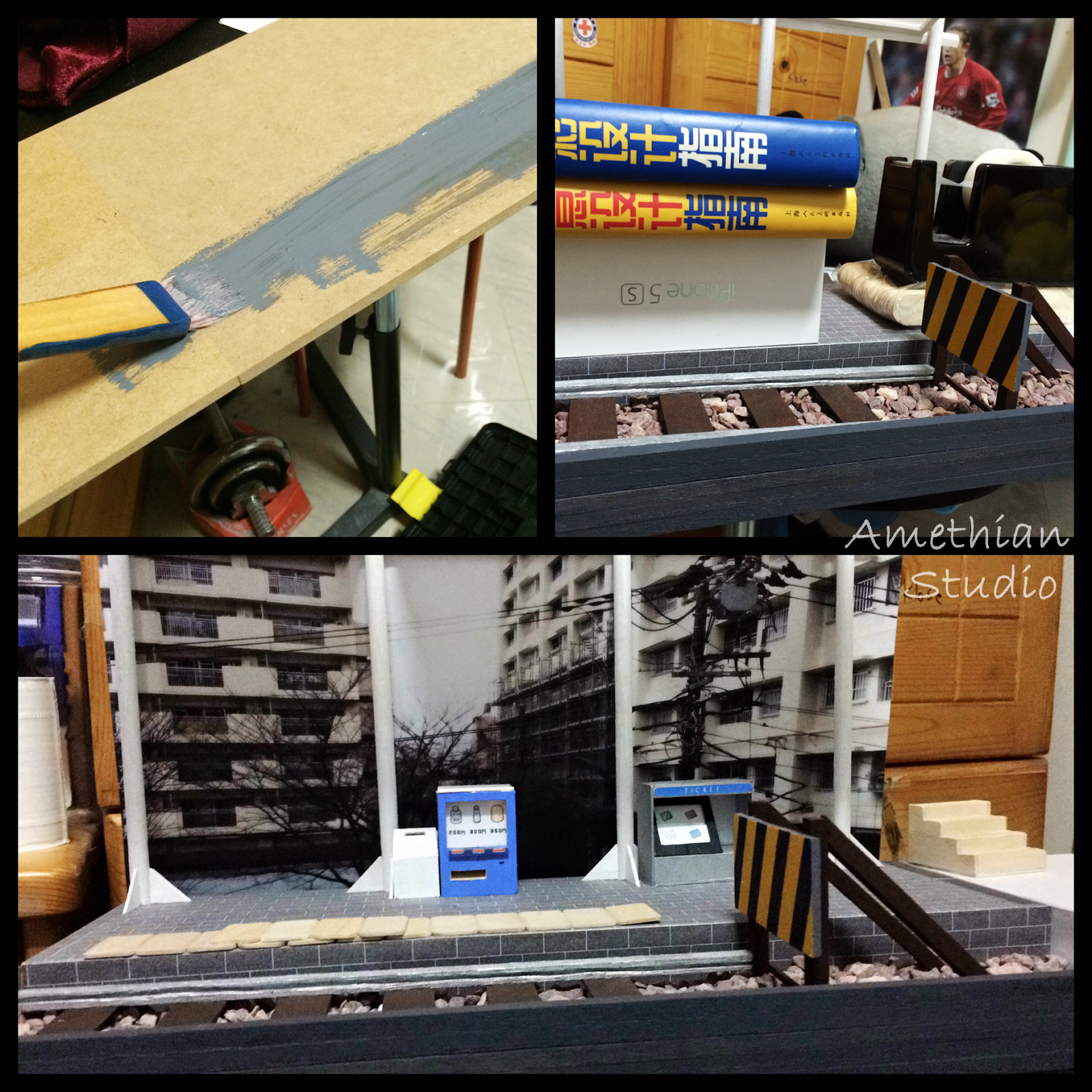 右上:把月台和出口位置黏在底板上,放上重物壓好。