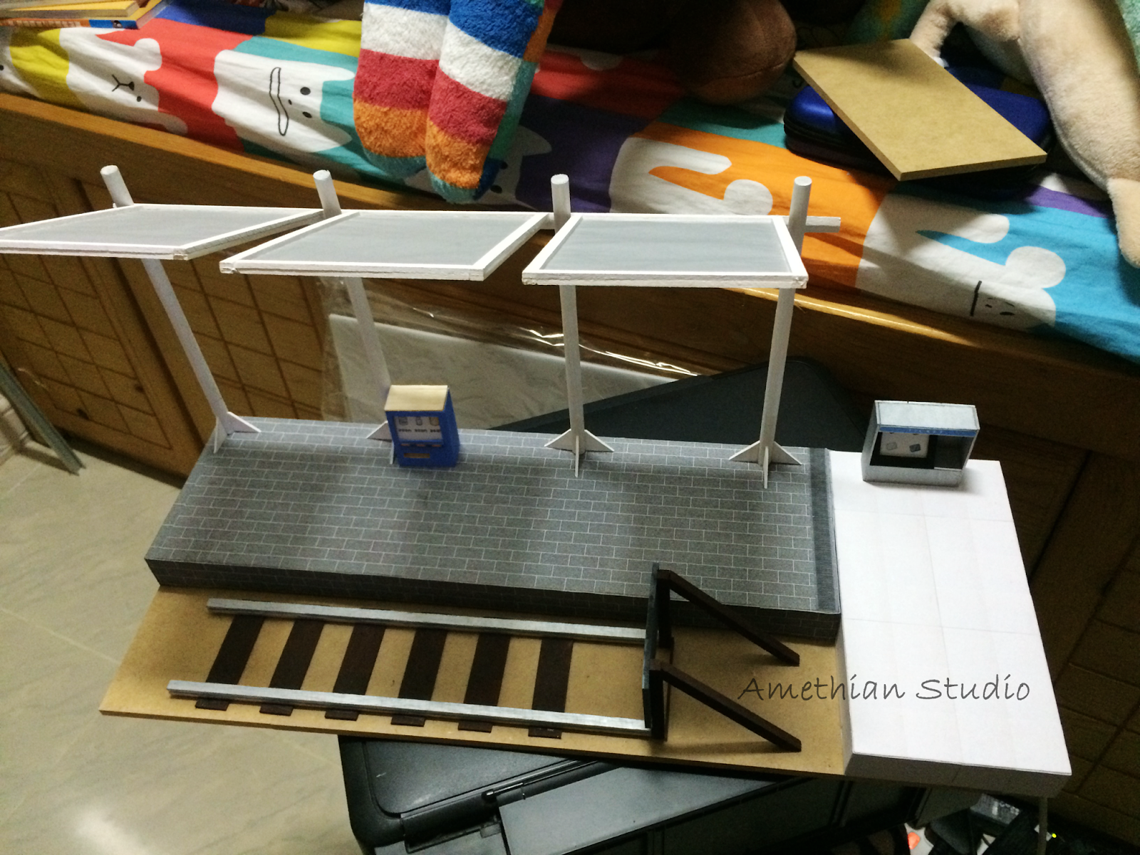 ▲ 車站的柱子。顏色選用了白色,共有四條,支撐著用牛油紙造成的頂部。 |