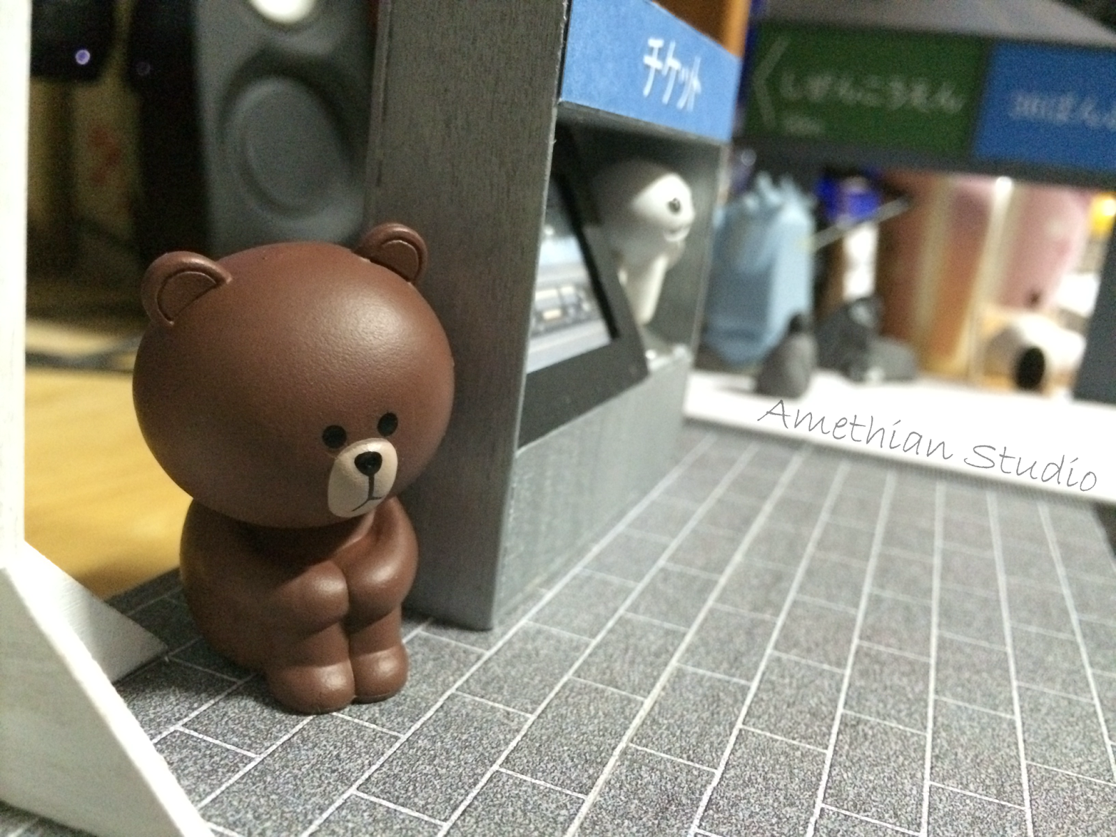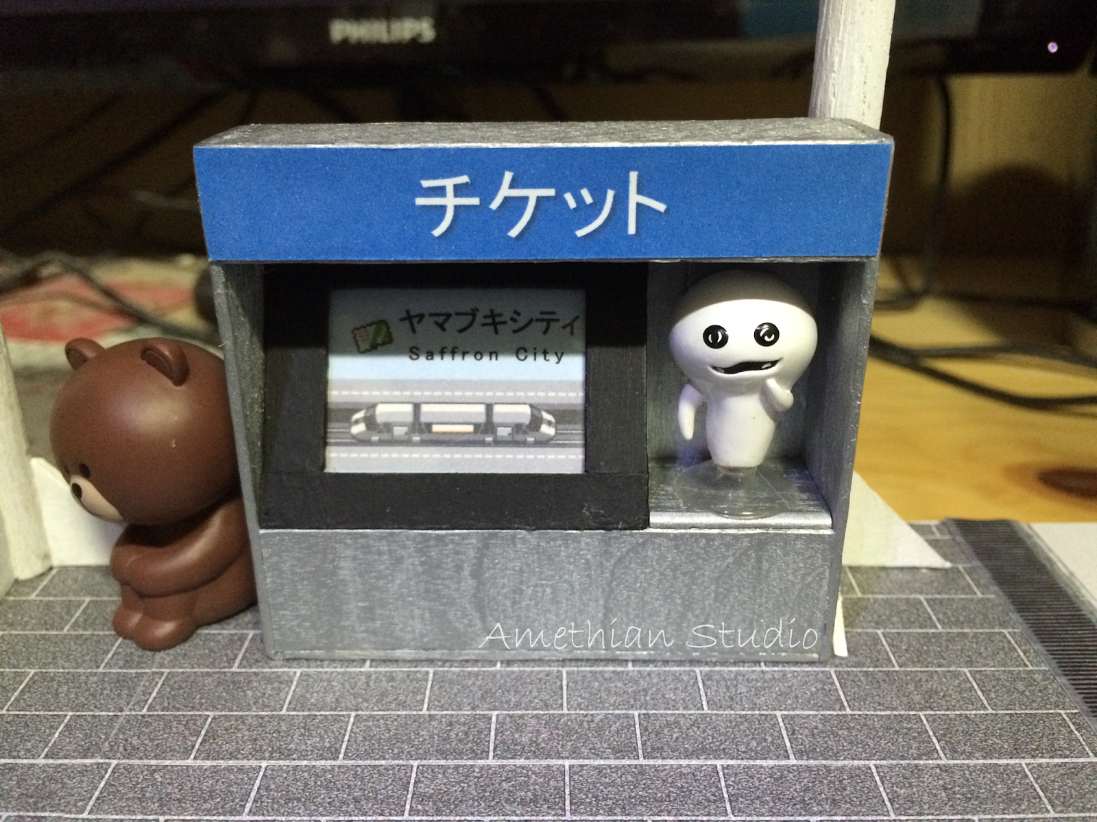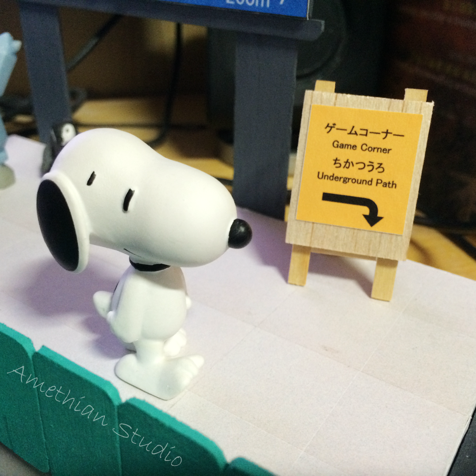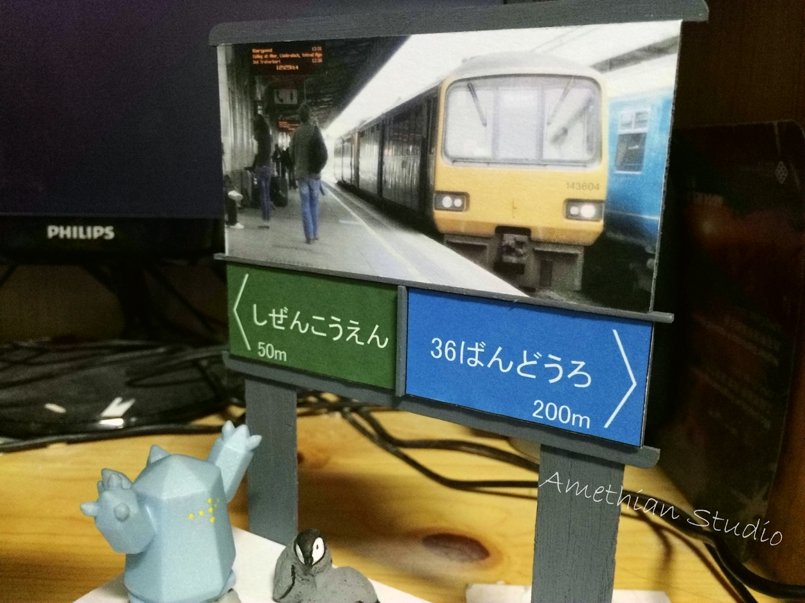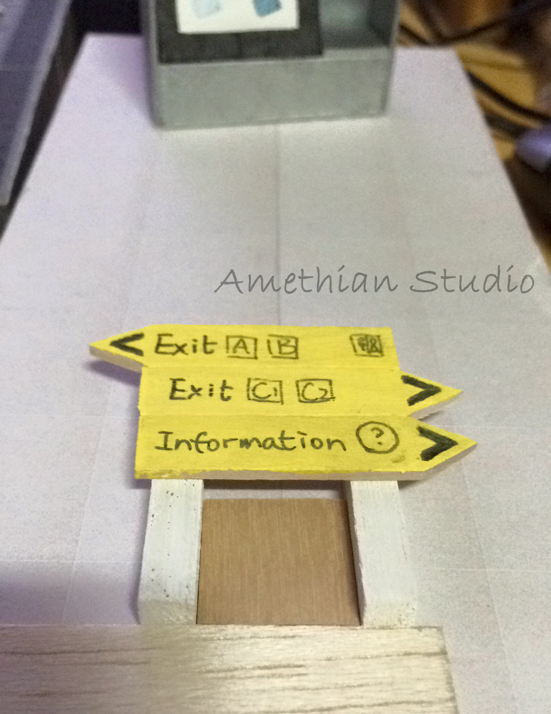 ▲ 有點土炮的指示牌。有趣的是,這個指示牌跟剛剛介紹到的自動販賣機和售票機,有著一個共通點:到最後都沒有出現在模型裡頭。 |