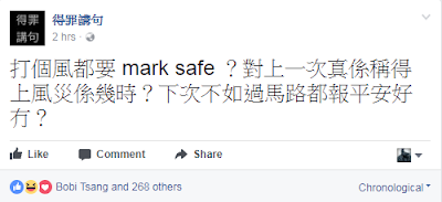 C'mon, 到底你期望得到甚麼回覆?這等狼來了式玩笑只會阻礙有需要的人得到援助,更不用說會敗壞香港人的形象了(如果還有得敗壞的話)。說甚麼「上 Facebook 不必太認真」只是偷換概念,事實上這種行徑已反映個別人士對災害和人命的輕視態度,絕不可取。長遠更會玩壞報平安的功能,誰也得不到好處。